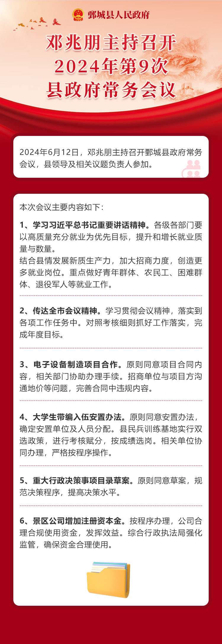 - 内容概述:【一图读懂】邓兆朋主持召开2024年第9次县政府常务会议