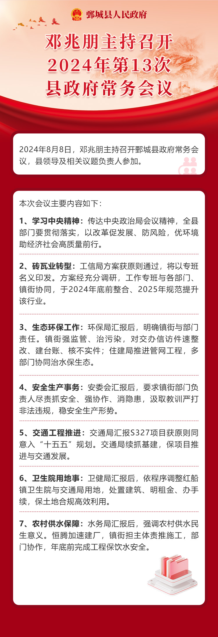 - 内容概述:【一图读懂】邓兆朋主持召开2024年第13次县政府常务会议