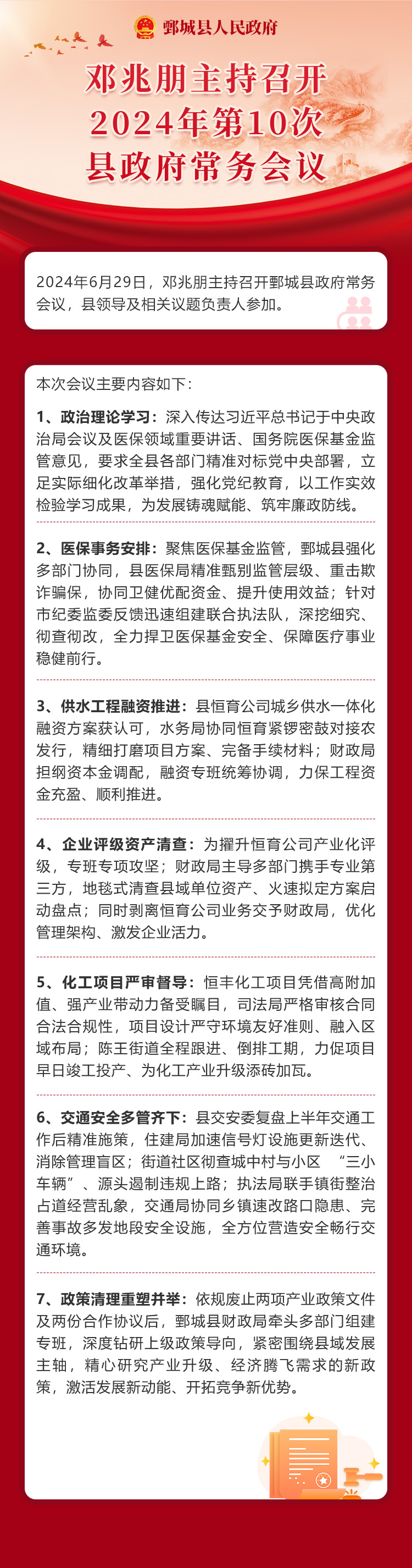 - 内容概述:【一图读懂】邓兆朋主持召开2024年第10次县政府常务会议