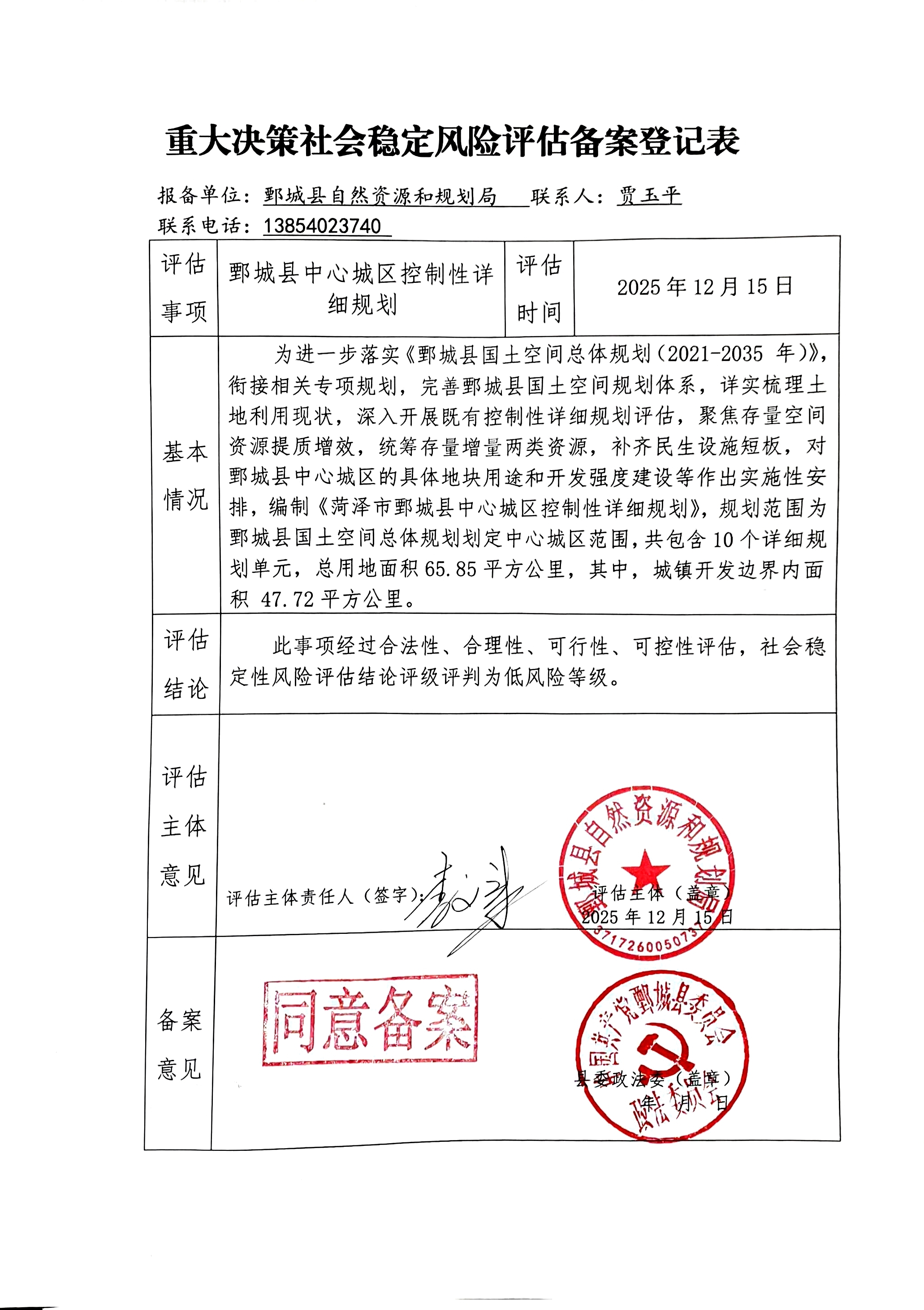 鄄城县中心城区控制性详细规划风险评估备案登记表