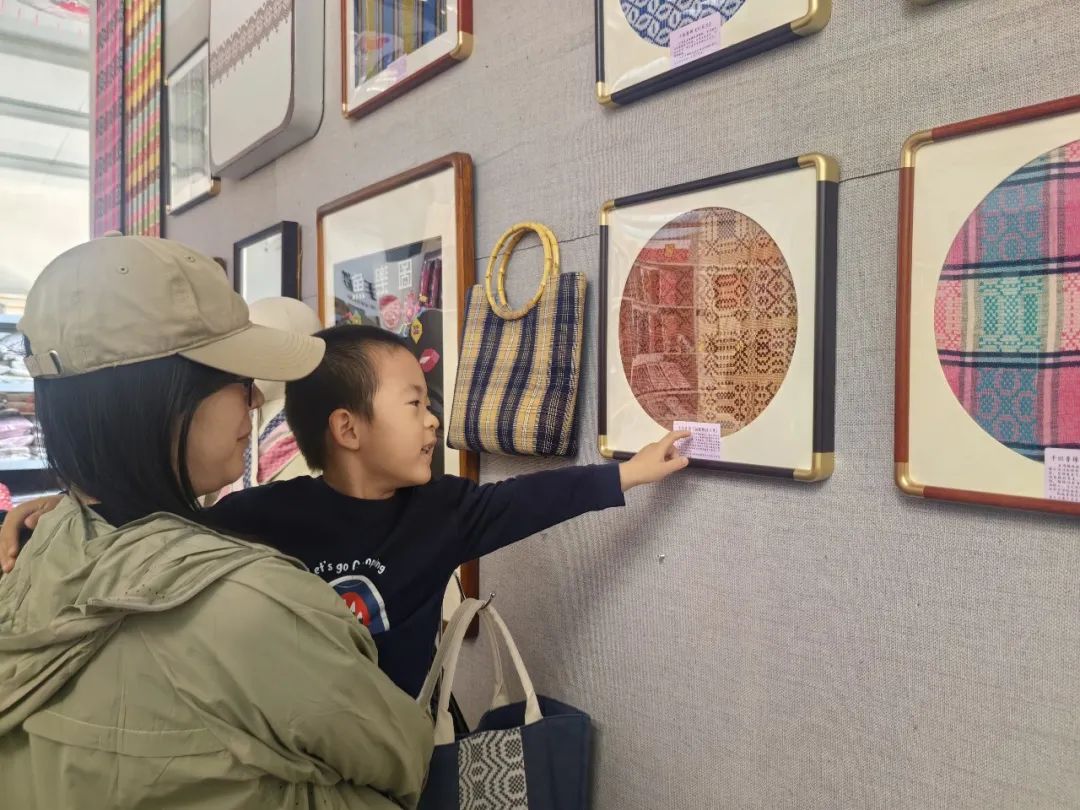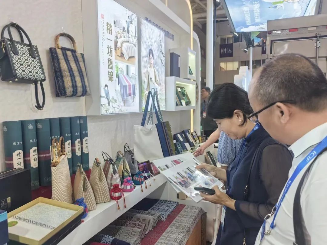 观众正在参观鲁锦文创产品。鲁锦是国家级非物质文化遗产,是中国传统手工织造技艺的代表之一。鲁锦文创产品品种丰富,融文化性、艺术性和实用性于一体。