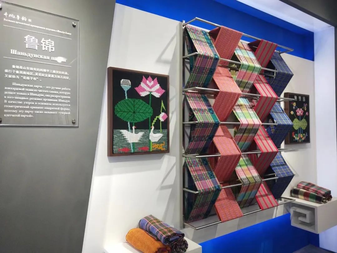 鲁锦展厅中手织鲁锦面料及鲁锦壁挂展示。鲁锦是国家级非物质文化遗产,是中国传统手工织造技艺的代表之一。中国鲁锦博物馆位于菏泽市鄄城县,是国家级非物质文化遗产专题博物馆,主要征集、收藏、展示鲁锦文化及研究鲁锦工艺。