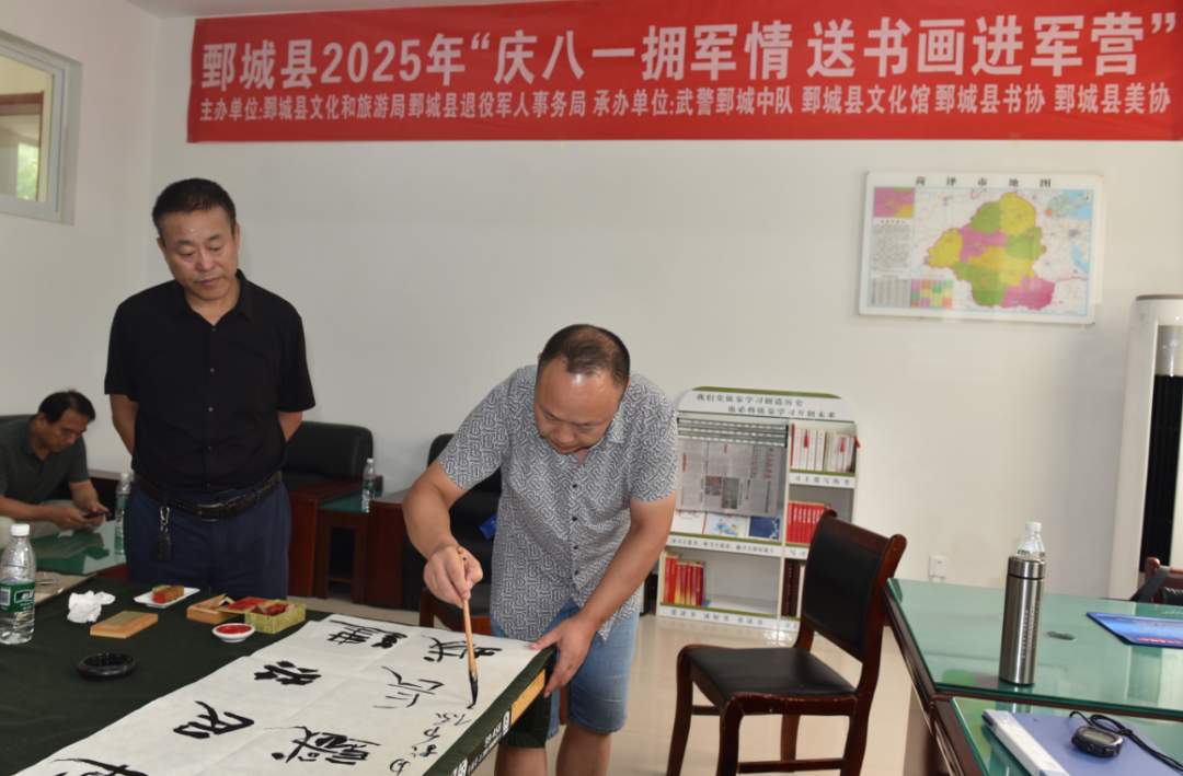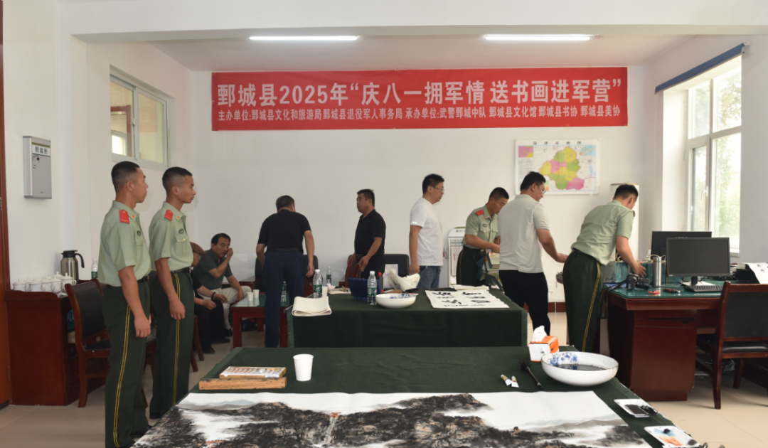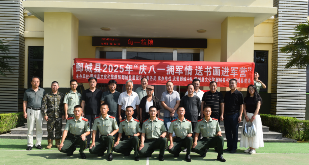 为热烈庆祝中国人民解放军建军98周年,进一步弘扬拥军优属光荣传统,密切军民鱼水情谊,2025年8月1日,由鄄城县文化和旅游局、鄄城县退役军人事务局主办,武警鄄城中队、鄄城县文化馆、鄄城县书法家协会、鄄城县美术家协会共同承办的“庆八一拥军情 送书画进军营”活动在武警鄄城中队营区成功举办。