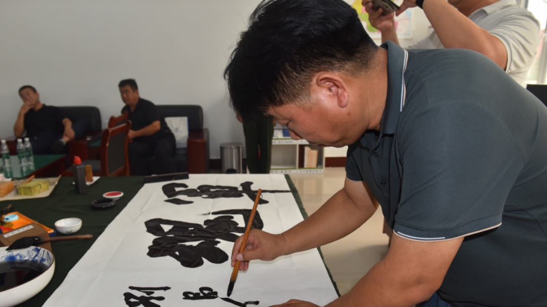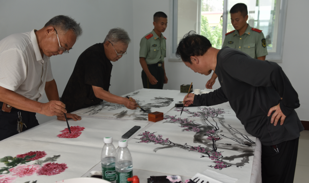 活动现场气氛热烈,翰墨飘香。来自县书协、美协的多位知名艺术家们满怀崇敬之情,铺展宣纸,泼墨挥毫。他们以饱蘸深情的笔墨,精心创作了一幅幅主题鲜明、意境深远的书法和绘画作品。这些作品或遒劲有力,颂扬军人保家卫国的忠诚与担当;或细腻传神,描绘军民团结一家亲的动人画卷。艺术家们全情投入的创作过程,深深吸引了在场的武警官兵,他们或驻足欣赏,或虚心请教,近距离感受着中华优秀传统文化的独特魅力,现场洋溢着浓厚的艺术氛围和融融的军民情谊。