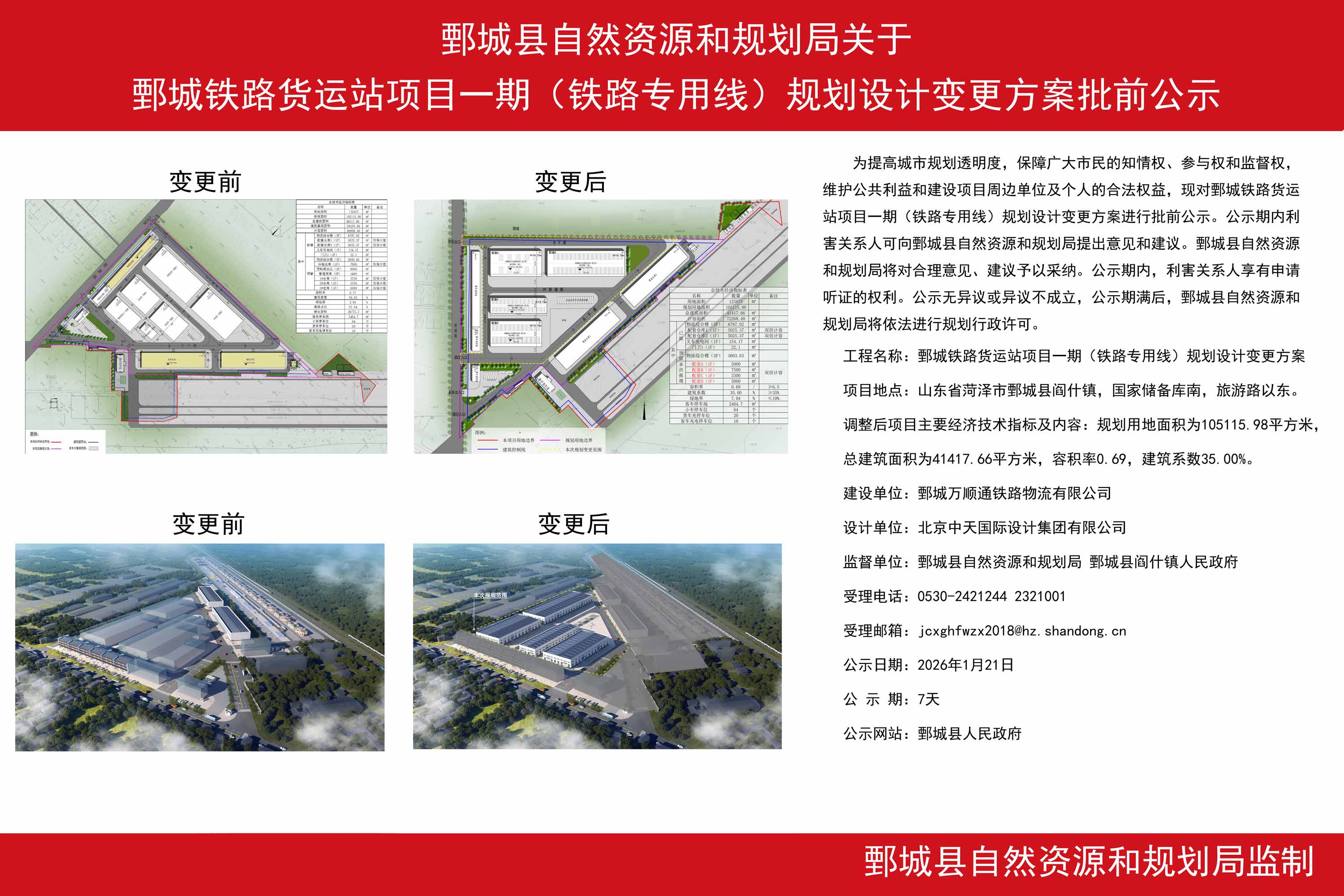 | 标 题: | 鄄城铁路货运站项目一期(铁路专用线)规划设计变更方案批前公示 | 发布日期: | 2026 年 01 月 21 日 |